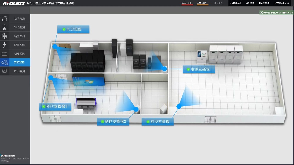 本次為阜陽理工學院提供配置的設備是安德力士品牌UPS不間斷電源主機、精密空調、動力環境監控系統一套,本次主要針對機房精密空調、漏水、煙感進行監控管理。