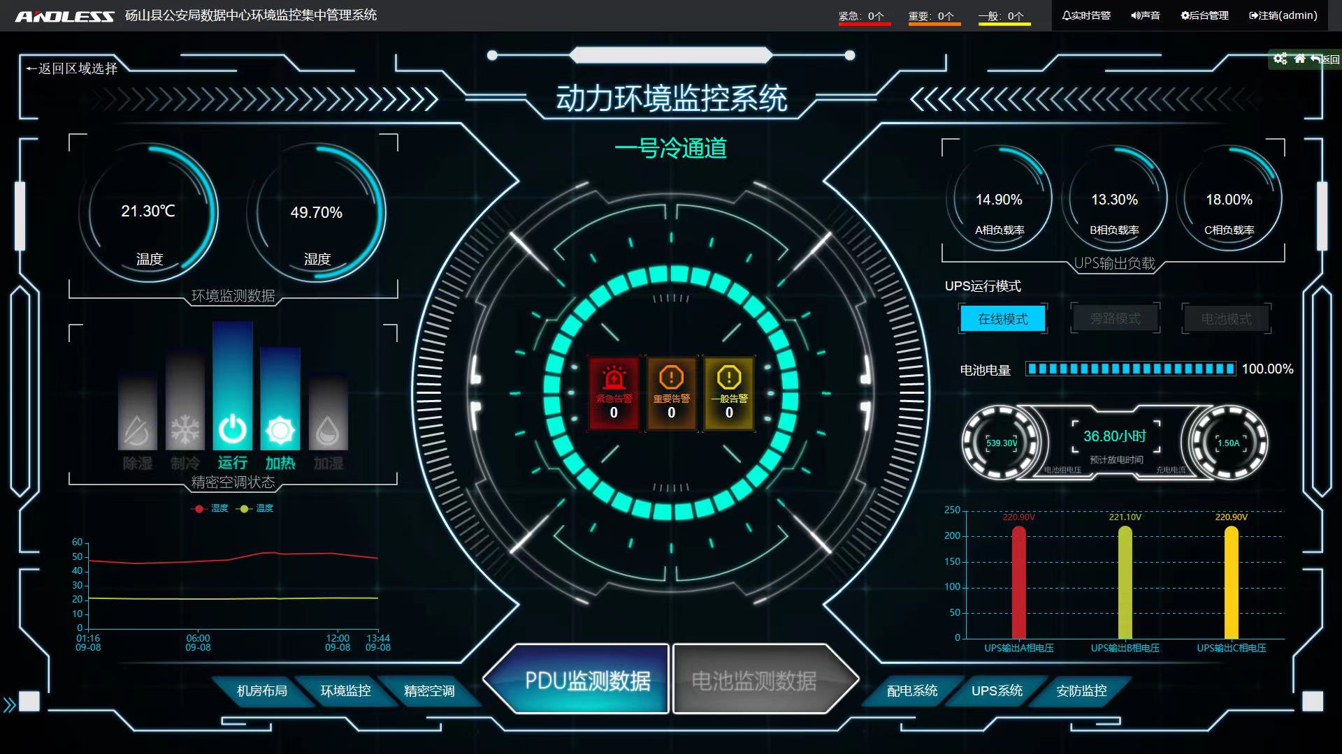 用戶使用3套安德力士的雙排冷通道,包含UPS不間斷電源系統、精密空調系統、環境檢測系統、配電系統、PDU監測系統以及一套環境監控集中管理系統,設備現已安裝調試完成。機房建設使用1套UPS電源為數據中心機房IT設備提供后備電源保障,機房使用12臺行間空調為IT設備提供一個恒溫恒濕的良好運行環境。碭山縣公安局此次招標采用我公司全套的安德力士UPS電源,產品包含安德力士GLS180KVA模塊機一臺、安德力士12V200AH電池320只以及電池柜、配電柜等輔材。