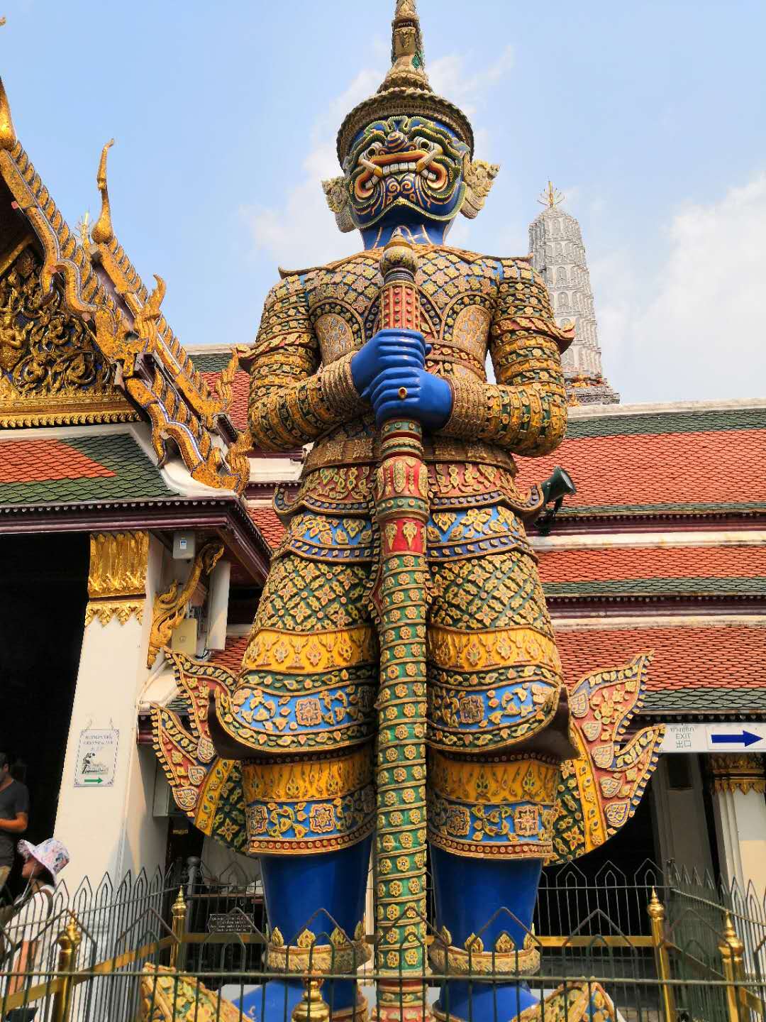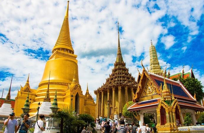 舉世聞名的大皇宮緊鄰著湄南河,是曼谷市中心內一處大規模的古建筑群。走進大皇宮庭院,首先映入眼簾的是如茵的大片草地和姿態各異的古樹,草坪周圍栽有一些菩提樹和其它熱帶樹木。大皇宮的佛塔式的尖頂直插云宵,魚鱗狀的玻璃瓦在陽光照射下,燦爛輝煌。尖角高聳的廟宇、佛塔,在陽光的照耀下,玲瓏剔透、金玉璀璨,雕功細膩、精致美觀的高大金漆佛像、石雕和繪有泰國傳統圖案的壁畫,記載著與王國和佛教有關的故事。