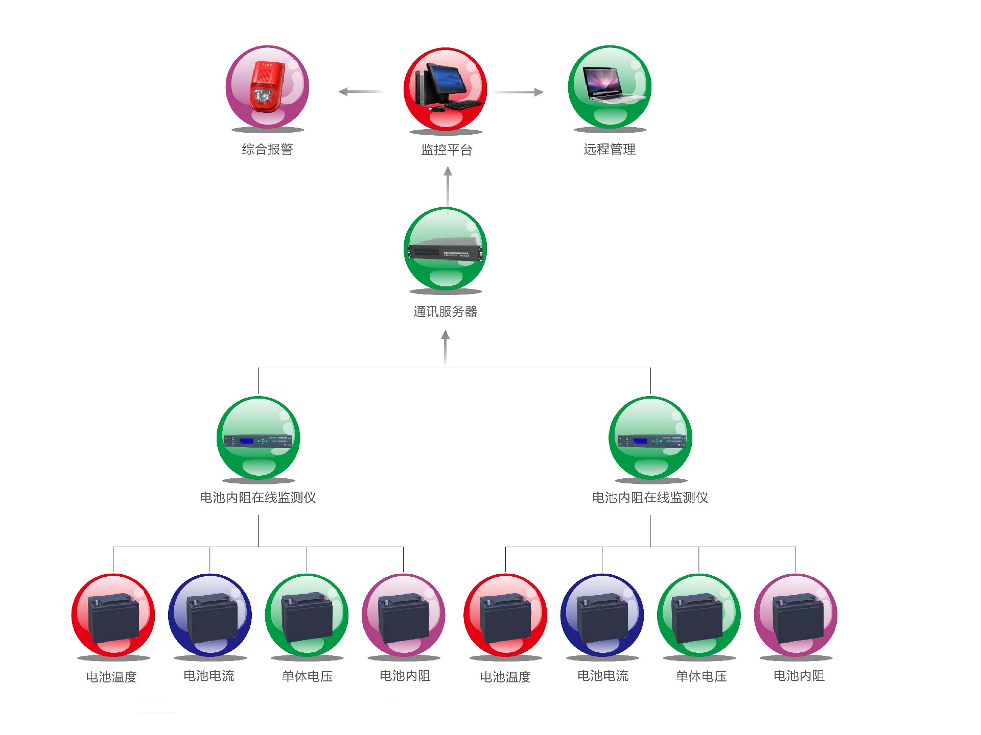 蓄電池是UPS系統(tǒng)的核心組成部分,它能夠在電力故障或斷電時提供臨時的電力支持,保證數(shù)據(jù)中心的正常運行。通過連續(xù)監(jiān)控電池狀態(tài),包括電壓、電流、溫度和內(nèi)阻等參數(shù),UPS能夠及時發(fā)現(xiàn)電池健康狀況的變化,預(yù)測潛在故障,并在必要時提前更換或維護(hù),從而避免突發(fā)性故障導(dǎo)致的服務(wù)中斷。這種監(jiān)測有助于延長電池壽命,降低維護(hù)成本,同時保證了電力供應(yīng)的穩(wěn)定性。蓄電池網(wǎng)絡(luò)在線監(jiān)測系統(tǒng)是我公司利用最新的單體蓄電池參數(shù)傳感器技術(shù),針對軍隊、通訊、電力、金融等領(lǐng)域蓄電池的使用現(xiàn)狀,開發(fā)的一套全新蓄電池網(wǎng)絡(luò)在線管理和監(jiān)測系統(tǒng)。該系統(tǒng)完美的結(jié)合了最新的在線蓄電池內(nèi)陰測量技術(shù)和計算機(jī)網(wǎng)絡(luò)實時通訊技術(shù),成功的解決了蓄電池的遠(yuǎn)程監(jiān)控和狀態(tài)檢修的問題,使得蓄電池的日常維護(hù)工作均在網(wǎng)絡(luò)監(jiān)控終端完成。